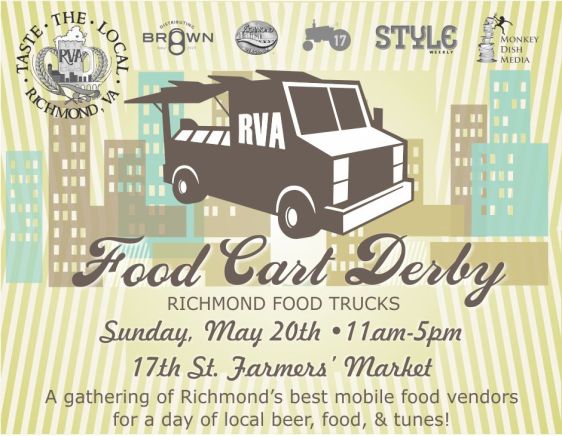 The final event of American Craft Beer Week is almost here. The Richmond Food Cart Derby will take place on Sunday, May 20th at the 17th St Farmer’s Market from 11am-6pm. Presented by Taste the Local, Style Weekly, Monkey Dish Media, 2BNB, Richmond 17th Street Farmers Market, Clear Channel, Radio Rubber Room, and Brown Distributing, the event will celebrate Virginia beer and local food.