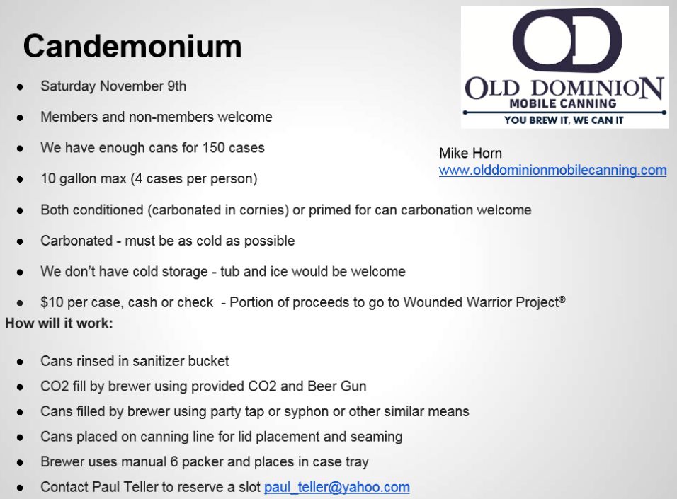 Been homebrewing for awhile now? Want to learn to can? James River Homebrewers and Old Dominion Mobile Canning have teamed up to present Candemonium next Saturday November 9th. To reserve a spot contact Paul Teller at paul_teller@yahoo.com.