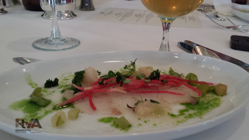← Previous Next → Collabeerate NBE 2014 004 Joe Sparatta: Local Fluke Sashimi with Lychee-Jalapeno Granita, Ginger and Basil