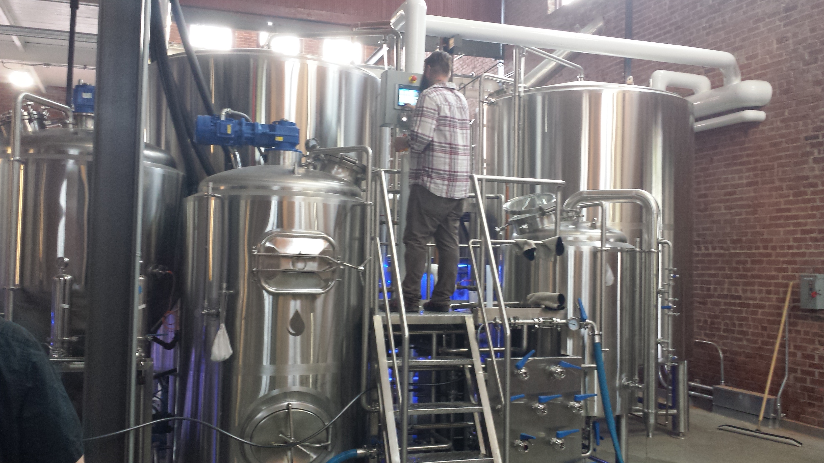 Head brewer James Frazer checks the 3.5bbl pilot system.