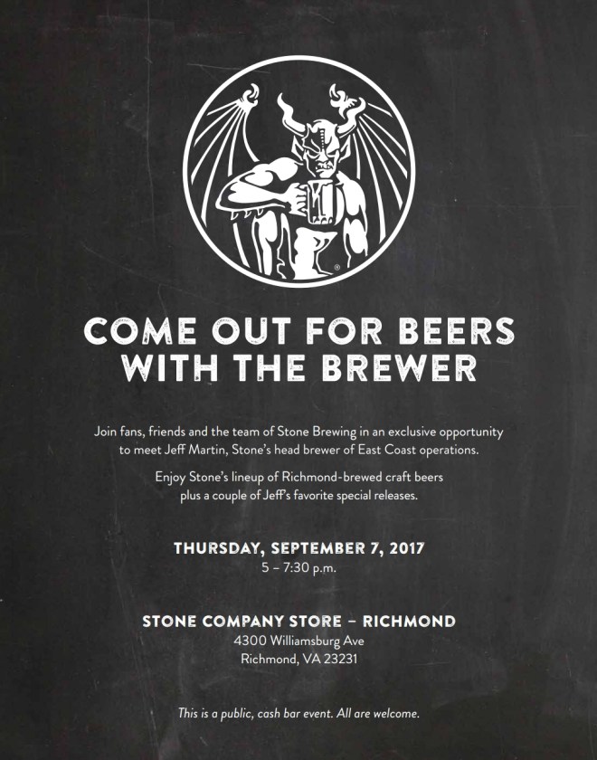 Head over to Stone Brewing Richmond get into the mind of their new head brewer, Jeff Martin, at a Meet the Brewer event tonight Thursday September 7th starting at 5pm. They will tap a few of Jeff’s favorite special releases along with other Stone beers.